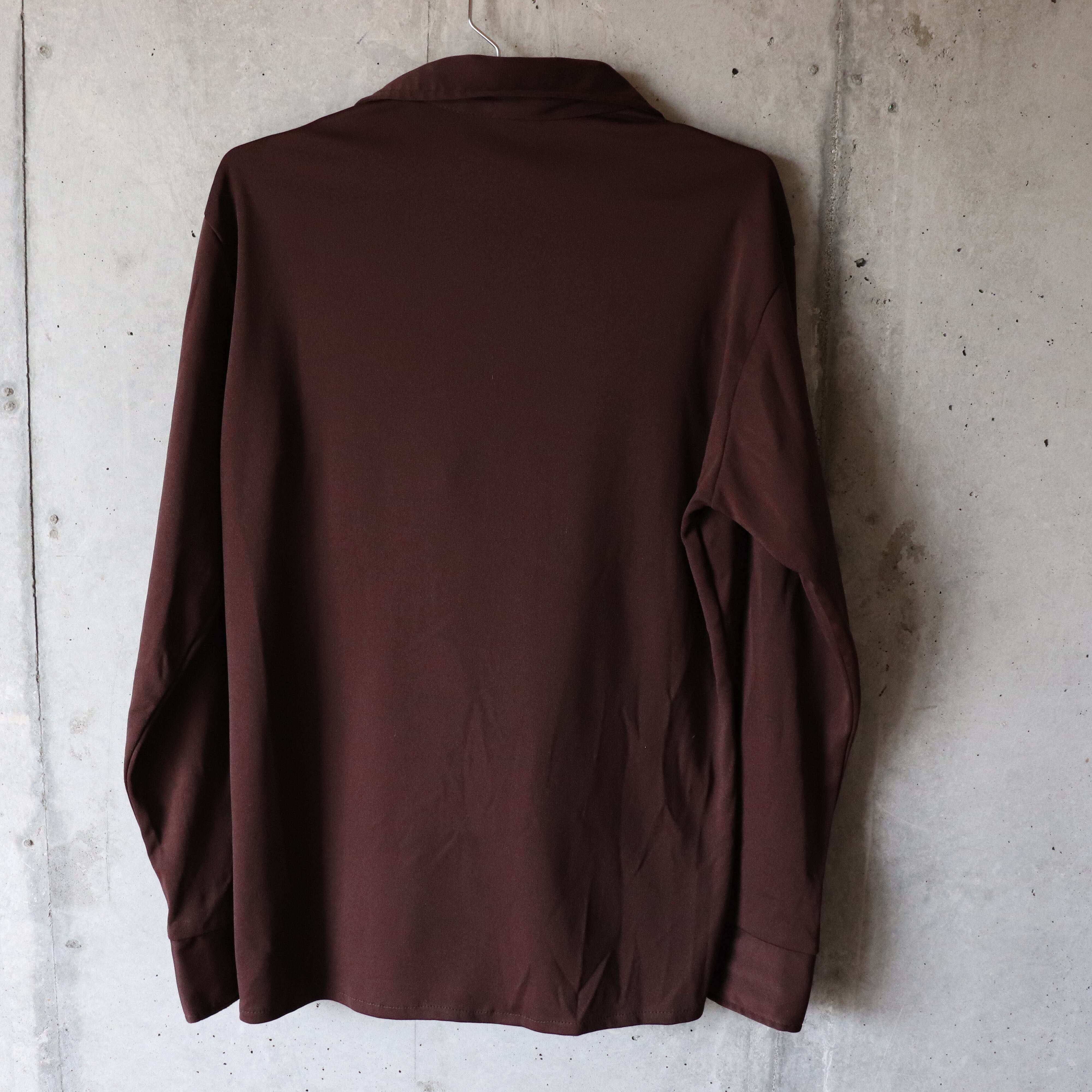 説明:1970年代の雰囲気を感じさせる茶色のポリエステル素材を使用した開襟シャツです。柔らかな手触りと独特の光沢感が魅力で、一枚で存在感を放つアイテムです。ヴィンテージならではの風合いが楽しめ、カジュアルからヴィンテージスタイルまで幅広くマッチします。